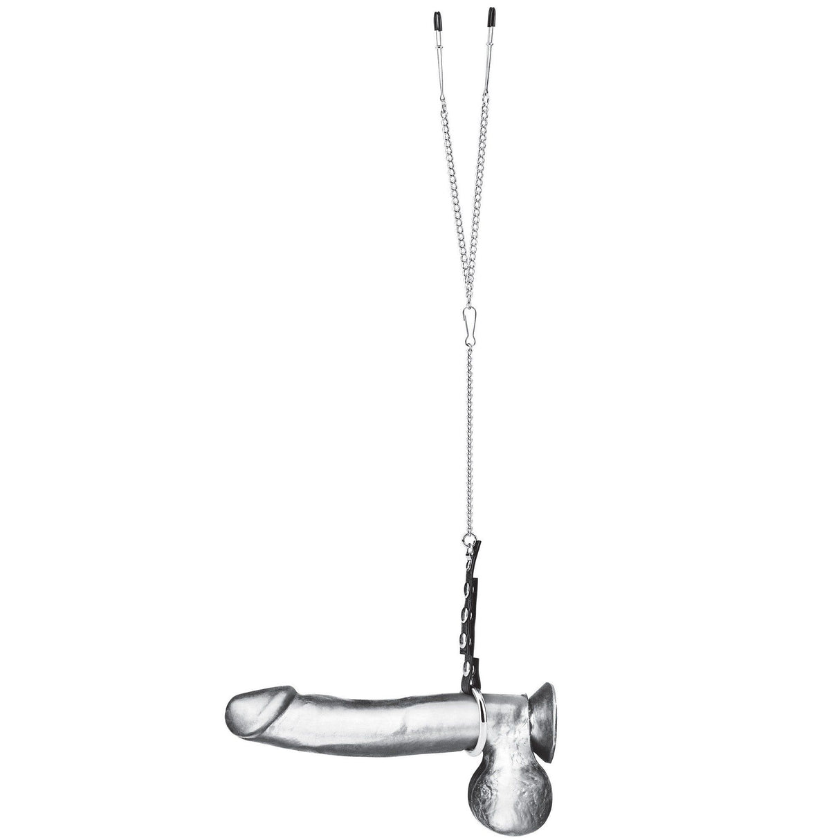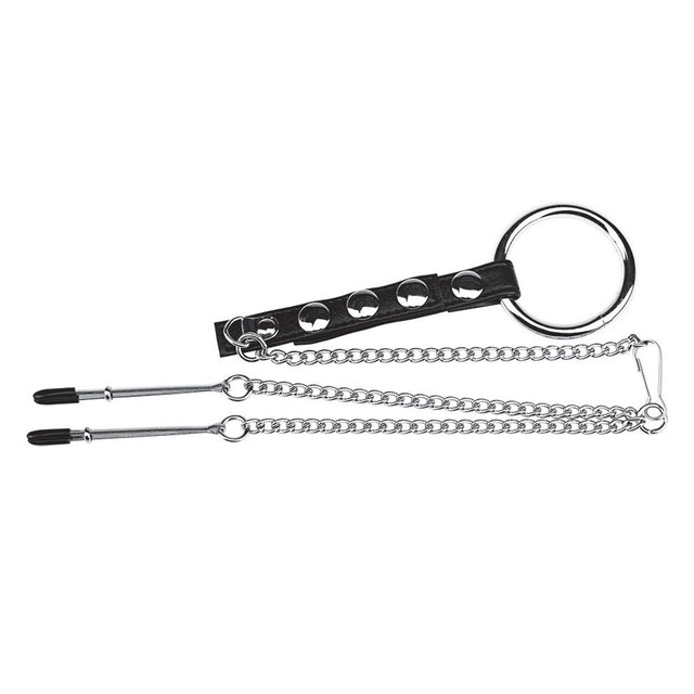 Standing at attention is the goal for this cock teasing Cock Ring with Nipple Tweezers. Boasting a more robustly erect penis and nipples when properly applied, this play on a nipple twister goes to work when the cock stands up, pulling on the nipples and increasing sensitivity. Place the ring around the cock and a clamp on each nipple. The device features an adjustable faux leather strap.