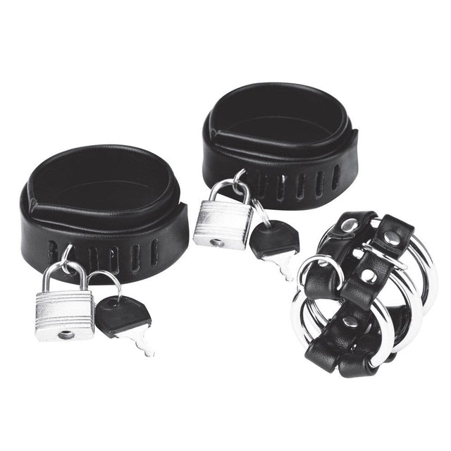 Cock, lock, and drop it! The Locking Ball Stretcher, Cock Ring, & Three-Ring Cock Cage hold your sub's contemptible cock captive with its three-ring cock cage, ball stretcher, and cock ring. The adjustable cock ring restricts blood flow while the metal cock cage restricts arousal and movement. The ball stretcher pleasurably elongates the ball sack, all working together to tease and torture the wearer into submission. Set is made of leather and metal, and comes with two padlocks with keys.