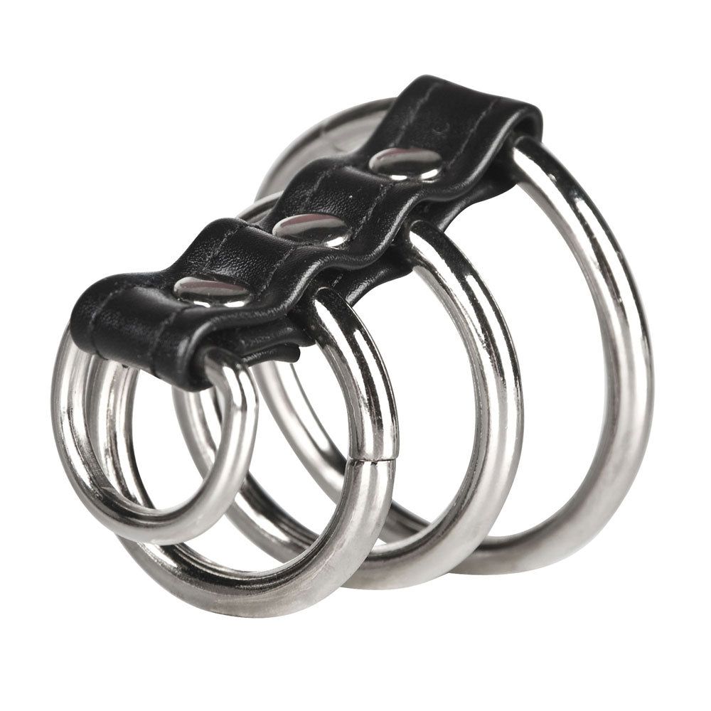 Hell is hot and hot is where the party is. Enter through the 3 Ring Metal Gates of Hell with Leash Lead to control your sub. Lead them on, literally, by attaching a leash of your choice to the D-ring while holding the penis and testicles hostage. A staple in cock and ball torture, this gates of hell includes four steel rings. The largest restricts blood flow to the balls, while the smaller two fit over the shaft. Use the smallest rings with a leash to lead by dickxample. No BDSM session is complete without this pleasure-pain device. Make it juicy with lube and keep it safe by limiting usage to 30 minutes.