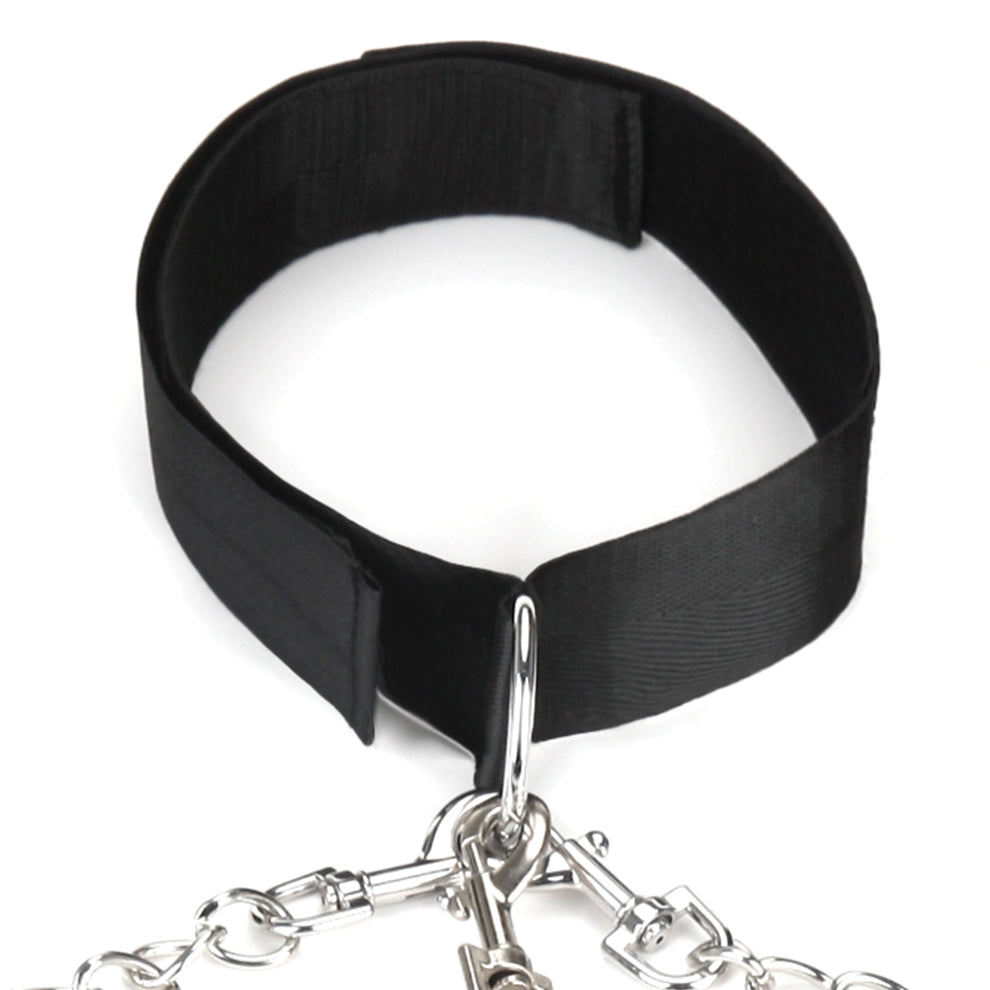 Tighten the cuffs and collar and take your sub for a walk. The Collar, Cuffs, and Leash Bondage Set by Lux Fetish comes with a removable, adjustable collar and two cuffs attached to a series of chains and a leash via D-Rings. The metal clips for the set allow you to use each piece separately or together. The Velcro cuffs are designed to secure rough play, but soft enough to make Kitten purr. Easily accommodates different positions. Comes with a blindfold for enhanced sensory play.
