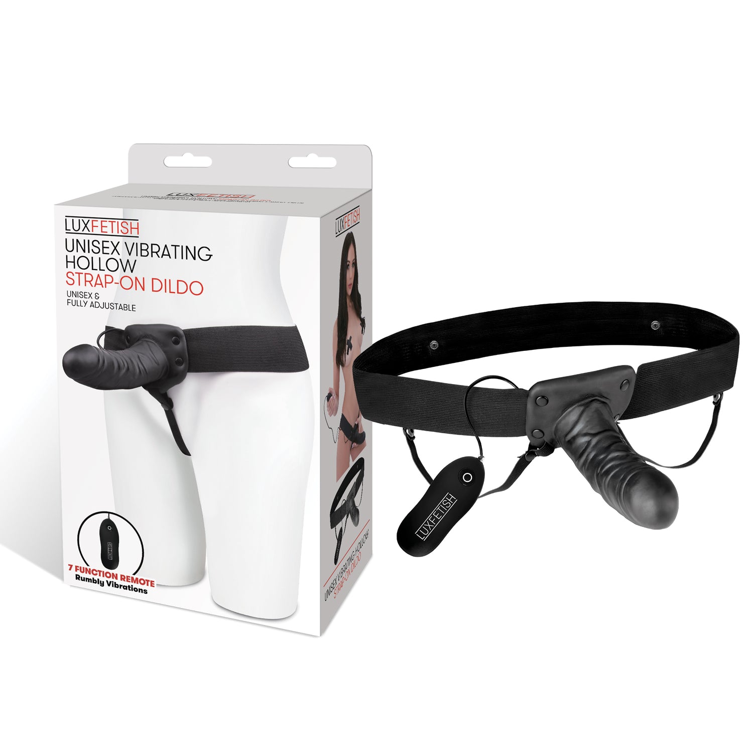 Who's is it? Anyone can dominate with this Unisex Vibrating Hollow Strap-On Dildo. This strap-on is designed for the adventurous couple looking to dig deeper into their penetrative kink performances. Made for literally anyone and everyone, this dildo has a hollow design to fit over a penis, but is also sturdy enough to perform penetration without one. The curved design hits the spot, whether G-Spot or P-Spot, and is entirely controllable with the wired remote that has seven different vibration settings. Comfortable in all positions and ideal for backdoor play, this vibrating strap-on is easily best-in-show. The harness waistband is adjustable for users of most sizes.